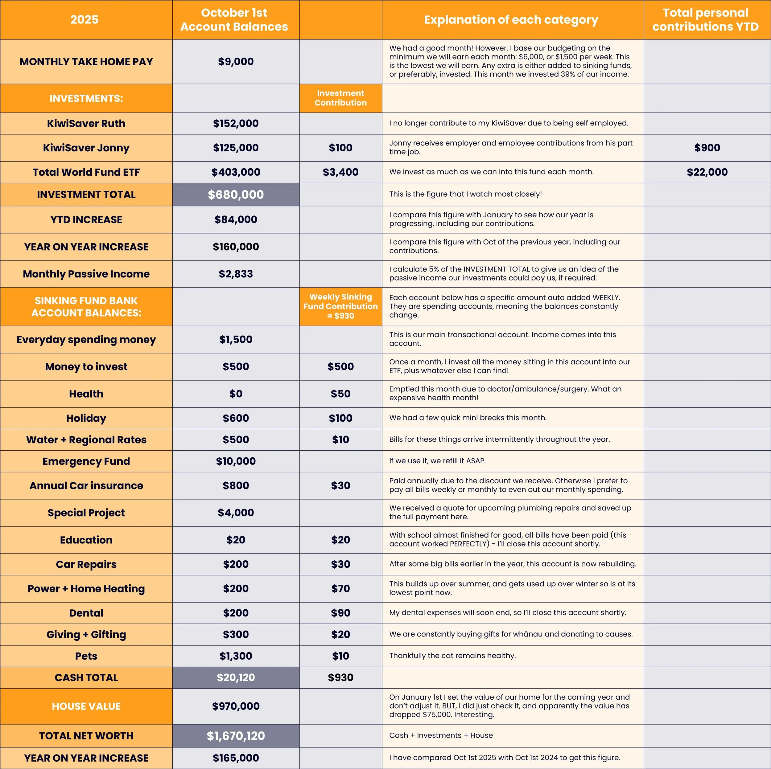 Fun Fact: I also track the net worth of our almost 18-year-old daughter. I’ve tracked her growth since she was seven, and it has been interesting to monitor her progress and educate her, sharing the information as a way to engage her with her finances. Jonny and I initially deposited money into her KiwiSaver and an ETF on her behalf, but as she began to earn and invest money herself, we reduced our contributions. She will be leaving home with ~$60,000 invested, plus cash savings. Proud parent moment right there! I’ll blog more about how she, Jonny, and I are preparing her to pay cash for university soon.