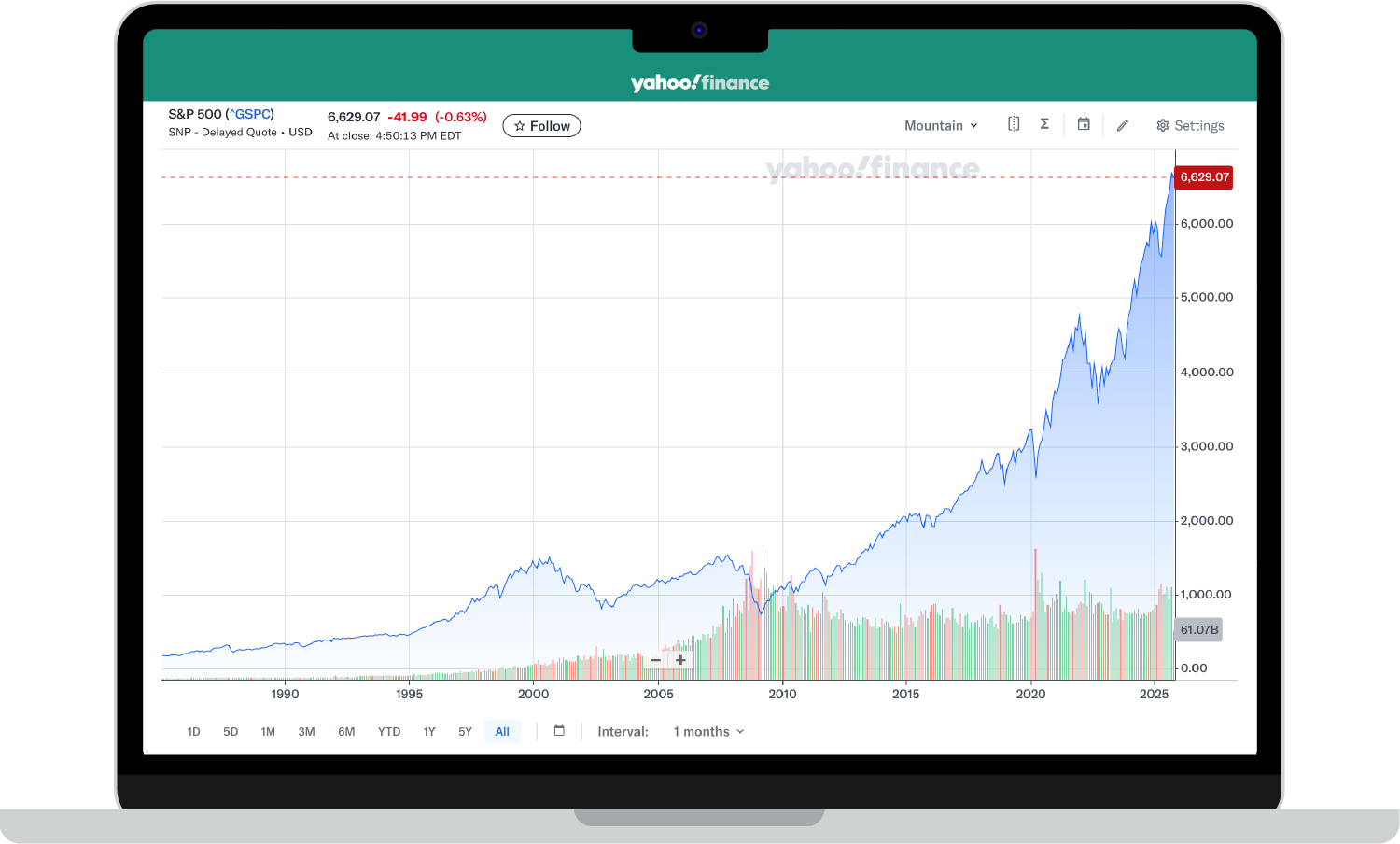 And if you're ever fearful, just Google “FTSE All Cap Index” or “S&P 500 Index” and zoom out to the max timeframe. What do you see? A relentless rise in the line on the graph, punctuated by dips and climbs. Sharemarkets are volatile in the short term, which is why we stay invested for the long term.